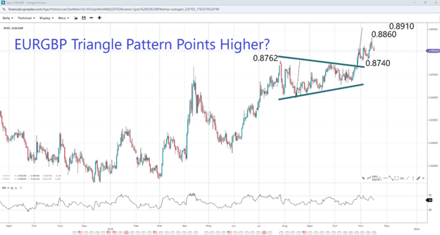 Traders will update their expectations for the ECB and BOE with the release of the latest CPI figures on Wednesday. UK October inflation is projected to slow to 3.7% from 3.8%, with the core inflation rate declining by a similar amount to 3.4% from 3.5% in the previous month. The final Eurozone October CPI is expected to be confirmed at 2.1%, down from 2.2% in September, with the core rate remaining unchanged at 2.4%.