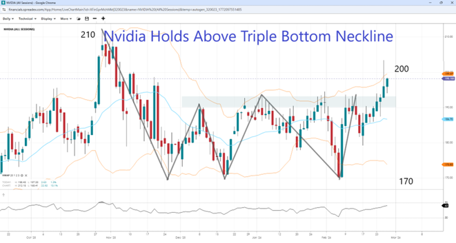 Nvidia bulls attempted to break out above $200 per share, but the upper VWAP put the run on pause. Still, NVDA stock may have completed a triple bottom at $170, with prices above the ~$190 neckline keeping the bias to the upside. As long as prices trade above this support, short-term resistance lies at the record peak of $210. However, if bulls fail to hold the level in a deeper pullback, support below the middle VWAP at $185 sits back at the $170 bottom, as the VWAP flattens.