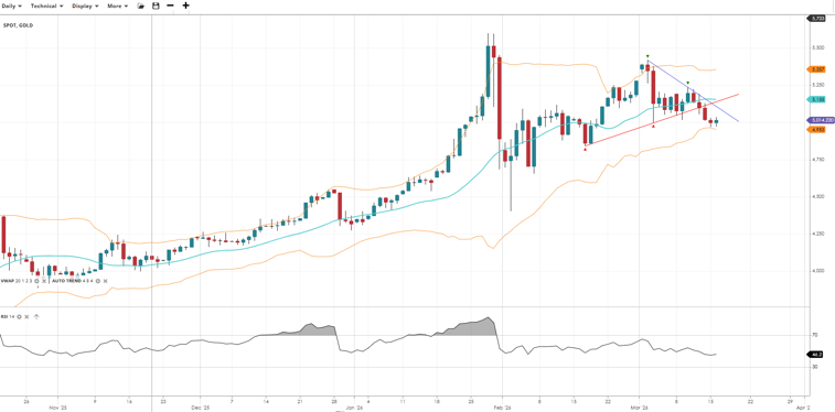 Gold remains in a broader bullish trend but has entered a corrective phase, pulling back below the VWAP after failing to sustain its early-year highs. RSI has eased to the mid-40s, reflecting fading momentum, with price consolidating within a narrowing structure as the metal awaits a directional catalyst.