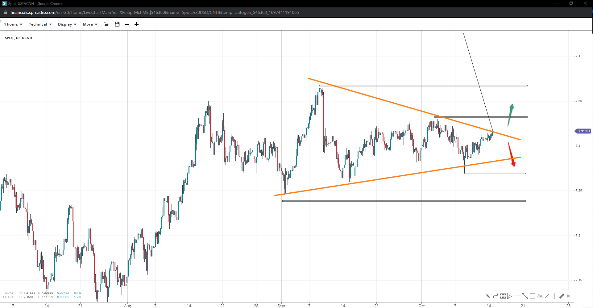 While USD/CNH has been consolidating, the recent short-term PA indicates a potential break higher on the back of a triangle completion down at 7.27 CN¥. Advancing past 7.33 will see increased chances of an attempt at the projected measured-move high of 7.42 unless bulls fail to gain momentum, losing the triangle low instead, opening the door to 7.24