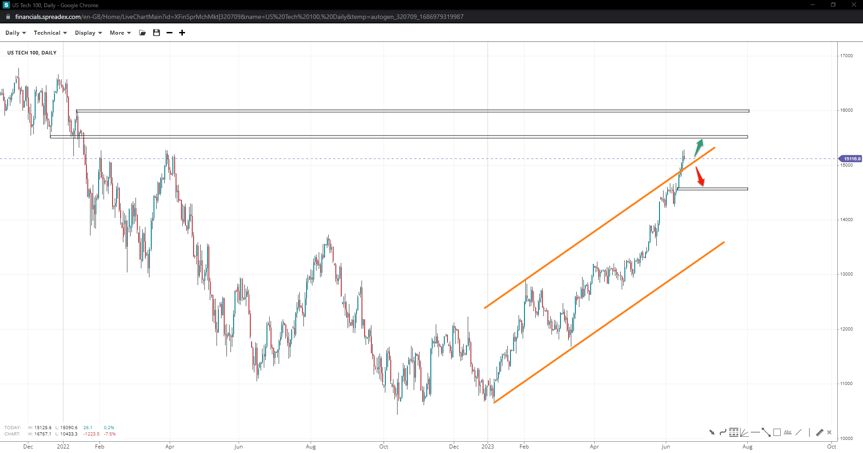 US Tech broke outside its ascending channel, entering an accelerated trend towards 16k with an interim resistance by 15500. Losing 15k will increase the chances of a slide towards 14500, but it is unlikely to reach 14220.