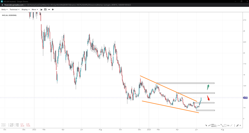 The stock price of NIO appears to have completed a falling wedge, with increased chances of a bottom being in. If bulls can reclaim $10.80, a renewed attempt towards fresh resistances might bring $13.25 in play. Otherwise, falling under $8.90 might clear the path towards the record low of $7.00.