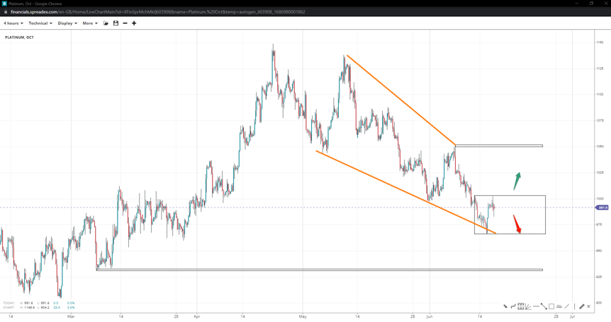 The completion of a potential falling wedge might have put a low in at $965/oz, suggesting an upward move towards 1050/oz may be due unless bulls fail to recapture the short-term 1k handle. In the scenario, a slide under the swing low might offer a chance at $930/oz, but probabilities for an extension towards the $900/oz barrier remain slim.