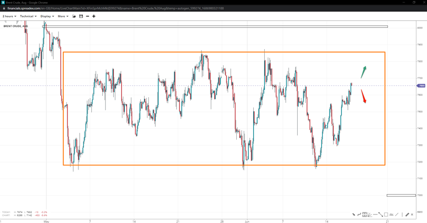 While the price of brent appears in bullish short-term sideways price action, the commodity trades inside a sideways range between $71.50/bbl and 77.50/bbl. A potential leg above the upper band might accelerate the price towards the $80/bbl handle with a recent bounce off the bottom. Conversely, a reversal at or before the top might trigger shorts towards the lower end of the range, aiming for the $70/bbl threshold, with interim supports at $75 and $73/bbl.