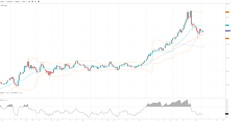 Gold’s bullish trend has paused into a correction, now trading at 4,002, still below the VWAP of 4,104. The RSI of 49.1 reflects a cooling momentum. Support is at 3,861, with resistance at 4,104.