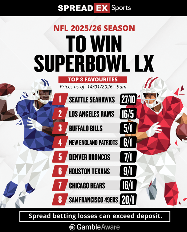 The NFL’s regular season is over and the countdown to Super Bowl LX is officially underway. With the Wild Card round taking place last weekend, the NFL Playoffs are in full swing and the best teams in the league are preparing for their biggest games of the year. Here at Spreadex, we have a plethora of markets for both fixed odds and spread betting so you can bet on all the action. Read on below for our betting preview, with key dates, information and betting odds.