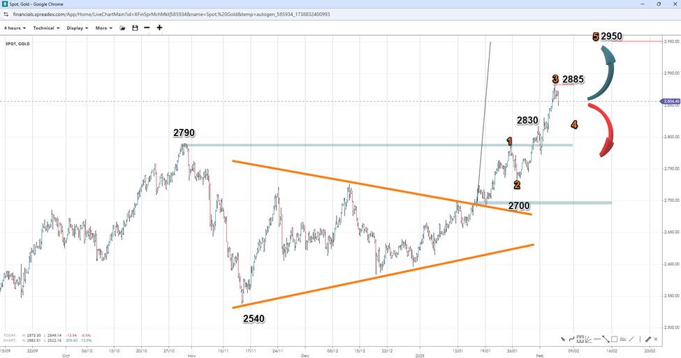 Participants will want to see if hiring and wage growth have indeed accelerated in January or if the JOLTS report and Q4 GDP figures were early signs that the labour market is not as tight as it seems. as it has probed new record highs this year, buoyed by tariff concerns and the potential for rising inflation. If the NFP beats expectations, it could raise inflation fears and boost gold. Conversely, a disappointment could bring more dovishness back into the Fed arsenal, which could also support gold.