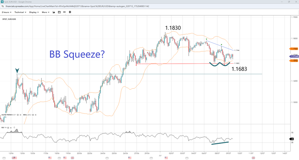 Despite falling since the peak of 1.1830, EURUSD has formed a double bottom at 1.1683, as indicated by the ‘autotrend’ support. If bulls hold the line, breaking the 1.1744-1.1750 area could boost the pair towards the 1.1800 handle and eventually reclaim the top. However, the descending tilt of the short-term trend, shown by the lower peaks at 1.1790 and 1.1766, along with narrowing 25-period Bollinger Bands, suggests a potential bearish breakout. Supports below the possible formation sit at 1.1632 and the 1.1600 round level.