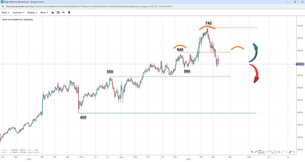 Despite trading positive year-to-date, Meta has tumbled 20% since peaking but may see a short-term V-shaped dead-cat-bounce (DCB) to form the right handle of a head-and-shoulders (H&S) pattern. Whether prices stop at $640 and revert or continue a tad higher still points to a potential downturn unless bulls reclaim the top. Losing the $580 and then $500 support levels before bouncing might accelerate the drop, likely to delay the bounce while exposing lower regions like the $500 and $400 handles.