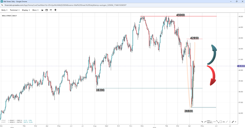 The Dow Jones has formed a double bottom at 37K following a V-bottom formation in the aftermath of a record-peak reversal at 45K, which could lead to 42850 should 41K give way to bulls. However, a decline towards 36600 remains possible, especially if 38390 shows weakness. As the index trades above the 40K round support, the odds of swinging towards either direction at par, the index may range.