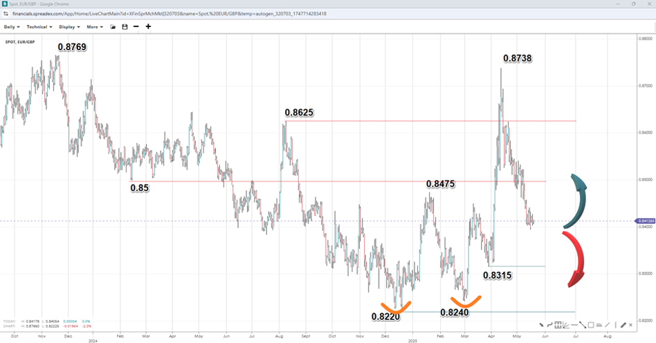 A double bottom pattern has formed in the EURGBP pair in the 0.8220-0.8240 area, sending the pair shy of 0.8769 to 0.8738, where prices reversed instantly at the 0.87 handle. The move now sits at the 61.8% retracement of the leg up at 0.84, with a failing support opening the door to 0.8315 and the bottom. Conversely, a bounce could see prices rise to 0.8475 and 0.85, with chances of reversal continuing to 0.86 and 0.8625.