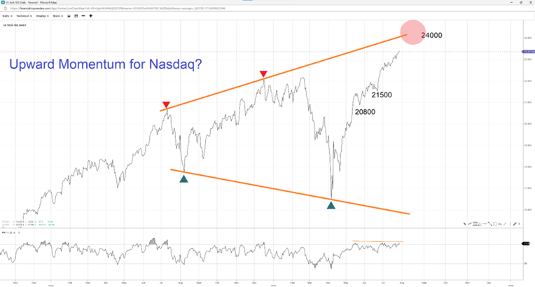 The Nasdaq has been trending upward since its April low, with the RSI fluctuating in and out of overbought territory, indicating a bearish divergence. An earnings-fuelled move upward could find resistance at the round 24000 level, with a break above coming up against the long-term upward trend line of the broadening triangle around 24500. If the market corrects, it could find support at the near-term swing low at 21500, followed by the May swing low at 20800.