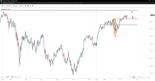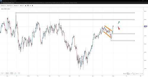 Wall Street is exhibiting an overall positive price action and is at the top of its consolidation range after ending a flag pattern. Investors should be cautious near 34500 and 34930 to uphold against pullbacks. Further drops may result in a retreat to 33600, while a successful break lower could target the 33190 mark.