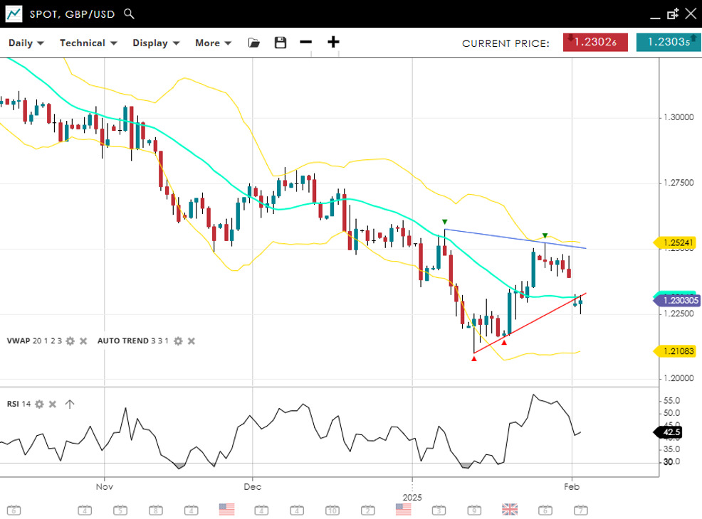 GBP/USD is maintaining its bearish trajectory in a new impulsive phase, currently at 1.2303, just under its VWAP (20) of 1.2320. Support is seen at 1.2108, with resistance at 1.2524. RSI at 42 suggests ongoing stabilisation, with the pair potentially attempting a corrective move before resuming its downtrend.
