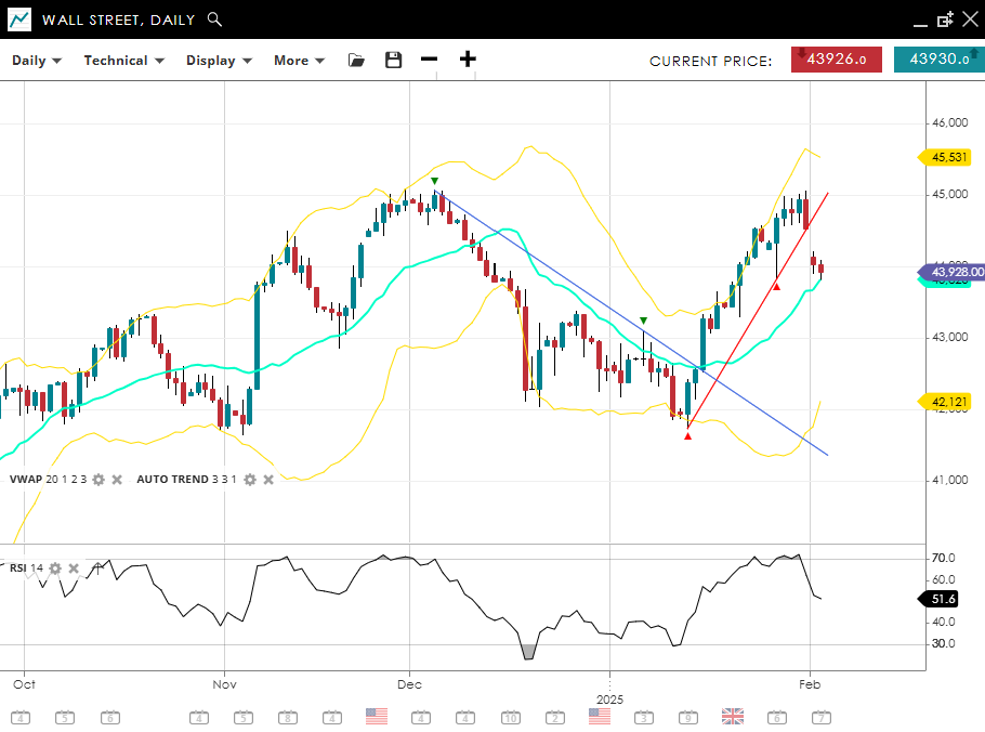 Wall Street continues to advance in its bullish impulsive trend, hovering at 43,928, just above its VWAP (20) of 43,920 but having dropped back from the record high. Support is firm at 42,121, with resistance looming at 45,531. The RSI at 51 indicates moderate momentum, suggesting that a fresh breakout or pullback may shape the next directional move.