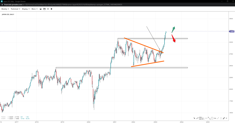 The completed triangle pattern in Japan 225 index provided a boost above 32k but has not reached the measured-move target of 33400 yet. The index might consolidate before spiking higher for a likely restriction to its upward trend, with 30k offering solid support in case 30750 succumbs to bears.