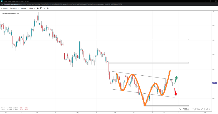 While copper appears weak in the short-term, bearish price action could be shortlived due to a potential inverse head-and-shoulders pattern. If the price remains above the right shoulder of 360c, a jump towards 400c could be seen unless 385c acts as a stumbling block. Losing the right shoulder swing will open the door towards 350c.