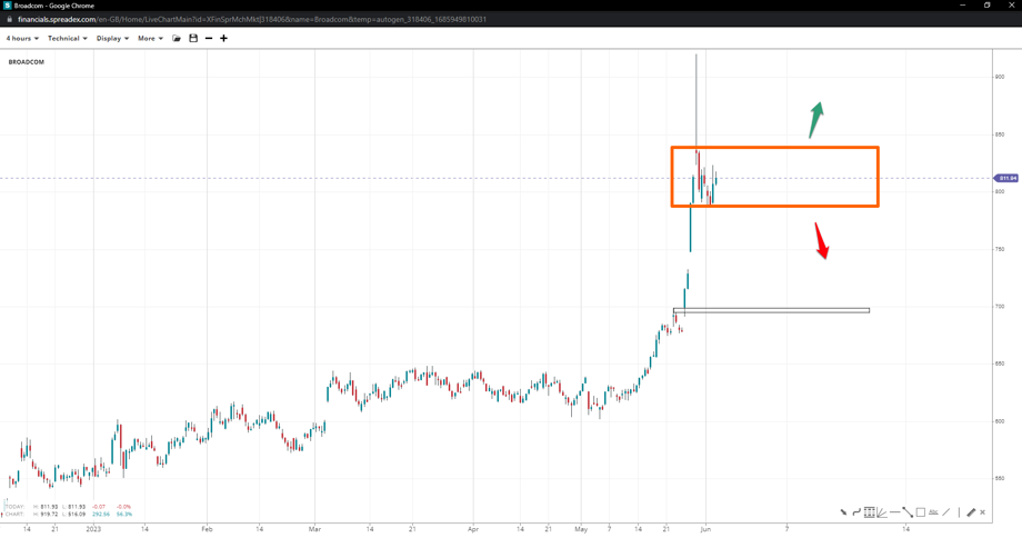 The stock price of Broadcom has spiked to 920 only to receive a massive rejection for a selloff to 785. If the latter gives in to pressure, its price could close the gap to 730, provided bears have plans to re-accumulate towards 835. Otherwise, the next support lies at the 700 support, with even a sideways mode expected to keep wild fluctuations at play.