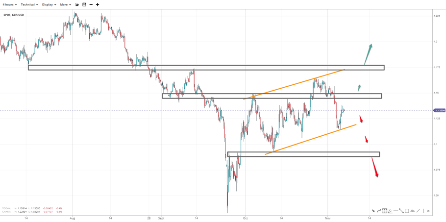 GBP/USD seems to be between a falling flag and an incomplete rising wedge patterns, with the former more likely. 1.15 remains a major resistance below 1.1750 – the extension of the upper trendline -with the lower trendline leading the way towards 1.0925 if 1.10 succumbs to pressure.