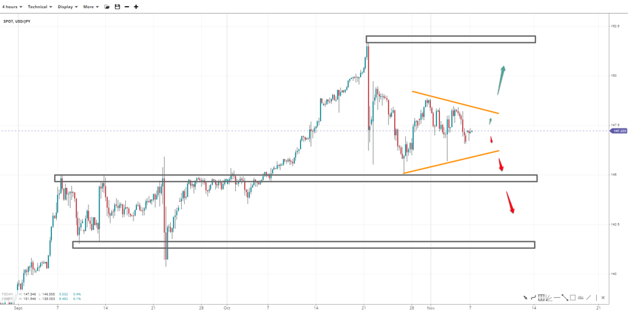 USD/JPY has consolidated in a tightening range, forming a potential triangle pattern. If the top trendline breaks, 150.00 is near-term resistance below the top of 152.00, where the break of the lower trendline could lead to 145.00 before the next move. In case it weakens, 142.00 is the next major support.