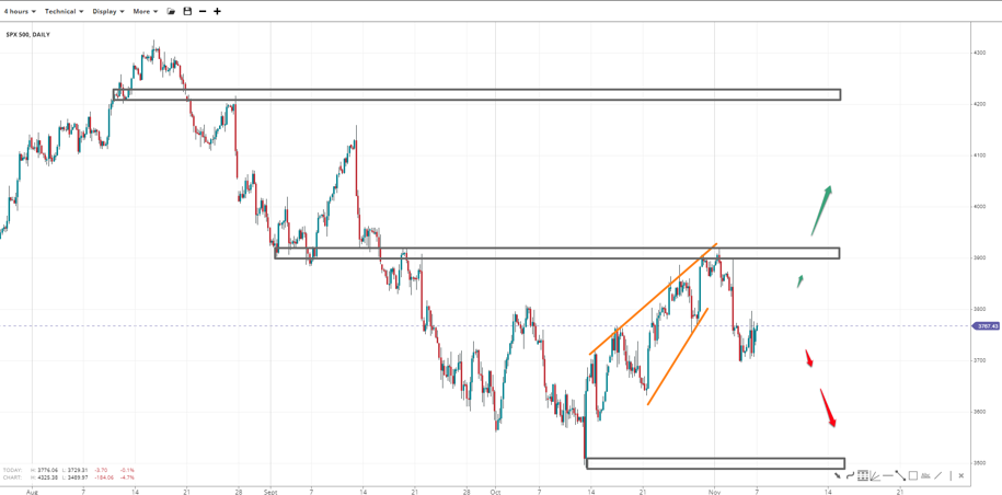 SPX 500 slid to 3700 after printing a rising wedge pattern. Ending a correction while it remains above the 3500 swing low could lead to the 3900 breakout and surge to the 4k handle. Above there, 4200 is significant resistance. Otherwise, the 3500 low could pave the way towards 3k.