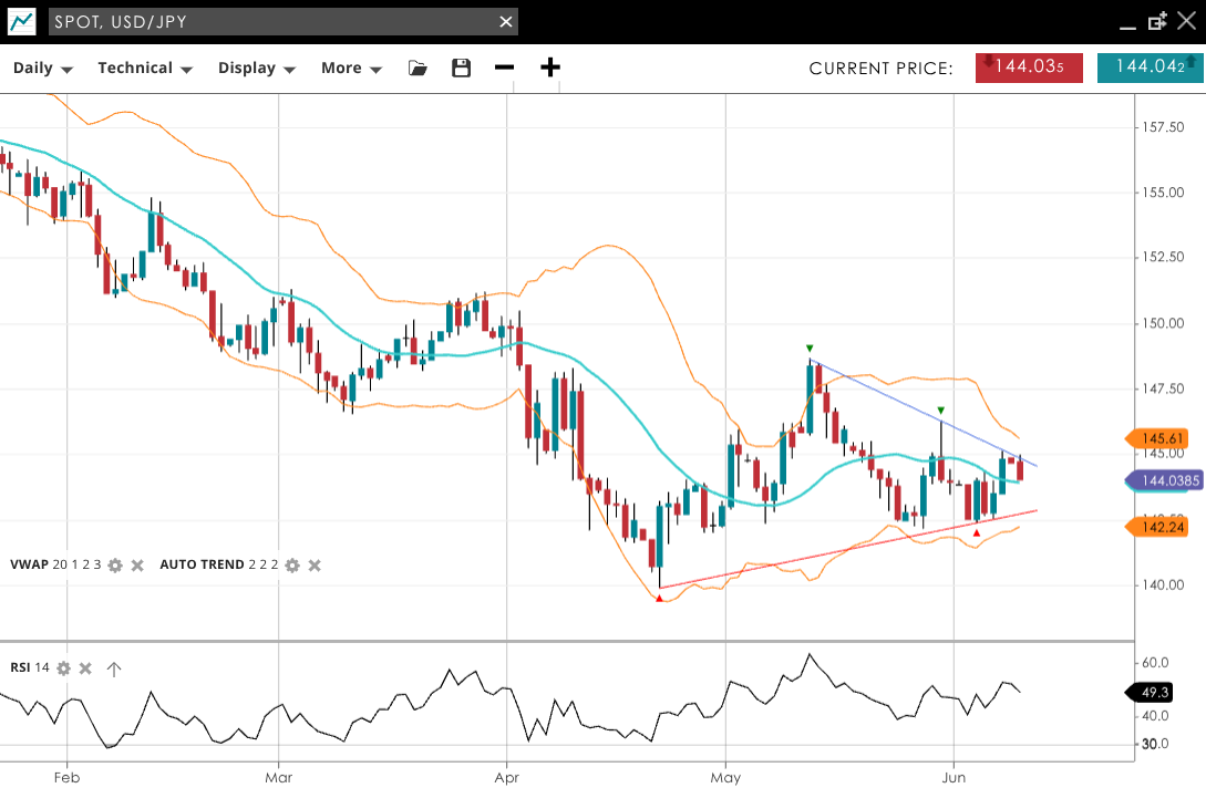 | USD/JPY | Neutral | Consolidation | 144.04 | 144.00 | 142.24 | 145.61 | 49.3 |