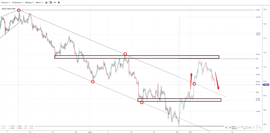 Silver rose above both the medium and short-term descending and ascending channels before returning to the 38.2% Fibonacci retracement of 17.40-21.30 near 19.80. Lower down lies the 50% and 61.80% retracements at 19.35 and 18.90. If the support holds firm, 20.00 comes back into focus, whether being the 38.20% or 50% Fibonaccis.