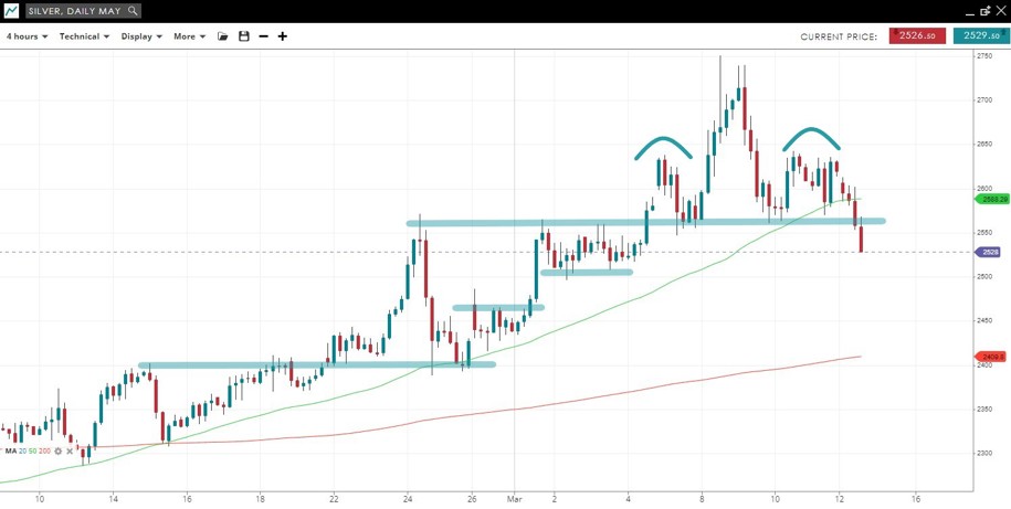 Silver is confirming the price action in gold with a break below the neckline of possible head and shoulders top pattern.