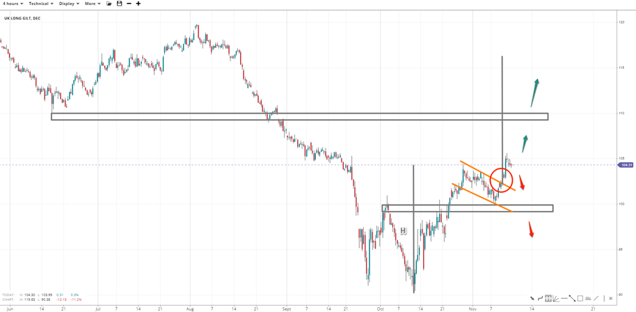 UK long gilts exited a rising flag pattern after a retest of the 100.00 round support with chances of heading above 115.00 increasing; this is where the height of the initial upward leg would bring gilts. 110.00 is significant resistance before there, but it must maintain an upward bias in triple-digits territories; otherwise slide back towards 95.00