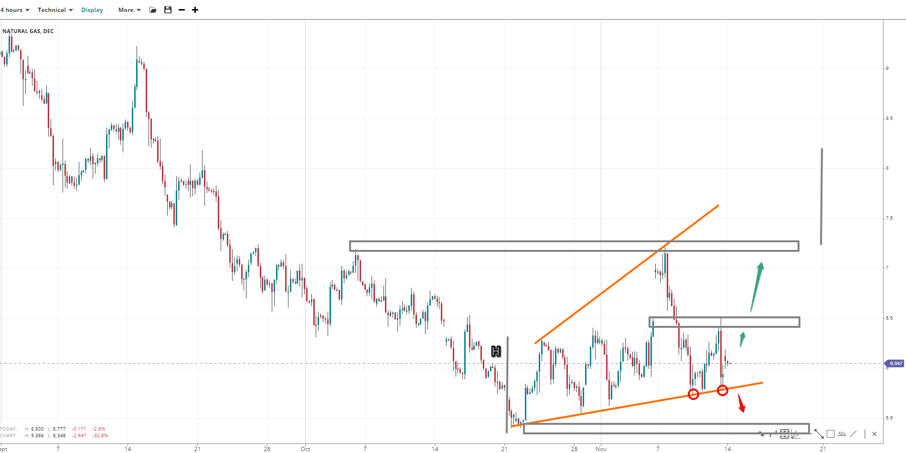 Natural gas has formed 4/5ths of a three-rising-valleys pattern, with the break of 6.5 and 7.2 paving the way to 8.30; the height of the first leg from the breakout point. If the lower trendline gives way, 5.35 will return to focus, with its defeat offering further downside toward 4.90 and 4.30