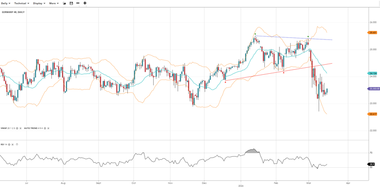 Germany 40 is in a bearish correction phase, having pulled back sharply from its recent highs and falling well below the VWAP. Price is attempting to stabilise near the lower standard deviation band, but RSI remains subdued in the mid-30s, indicating that sellers retain the upper hand and any recovery could face significant overhead resistance.