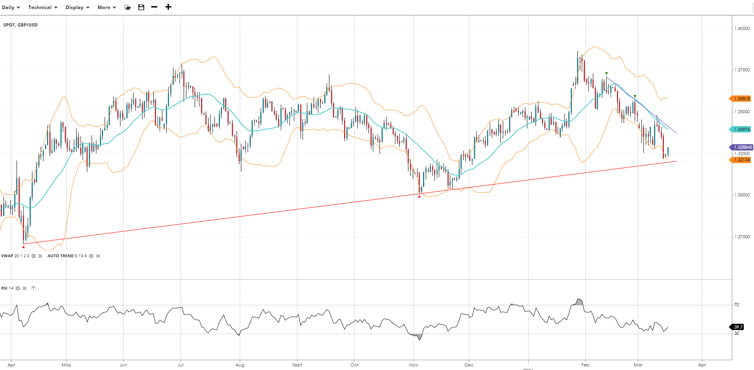 GBP/USD remains in a bearish near term trend within its broader sideways range, trading below the VWAP as it consolidates its recent losses. RSI has recovered from oversold levels into the low 40s, suggesting some stabilisation, though the pair remains vulnerable to further weakness while it holds beneath the VWAP.