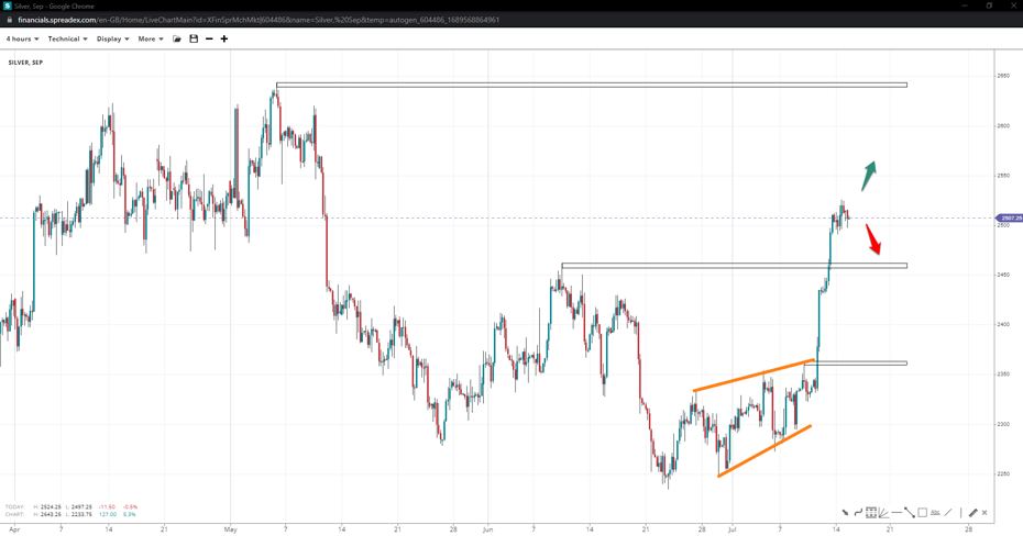 While the German index resembles a flag, it might be in a broadening wedge pattern towards 15500. If bulls have a go at the top of 16430, the flag could be validated, opening the door to 16750.