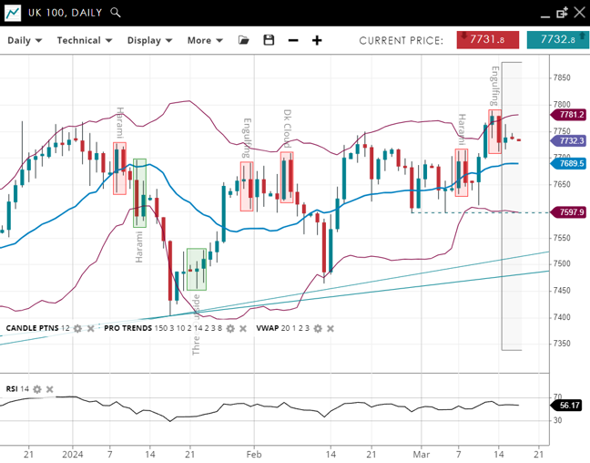 UK 100 is currently in a neutral trend, showing signs of consolidation, with its price at 7,733, positioned just above the slightly increasing 20-period VWAP of 7,689. The index's support level is now at 7,597, with resistance identified at 7,781. The RSI has risen to 56, indicating a mild shift toward bullish sentiment.