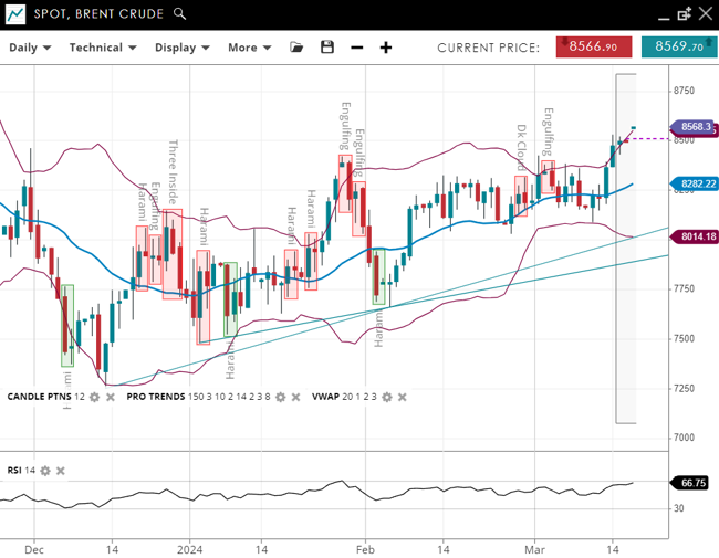 Brent Crude has entered a bullish trend, now in the impulsive phase, with its price increasing to 85.60, significantly above the 20-period VWAP of 82.82. The support level is at 80.12, with resistance closely set at 85.76. The RSI has improved to 67, indicating stronger bullish momentum.