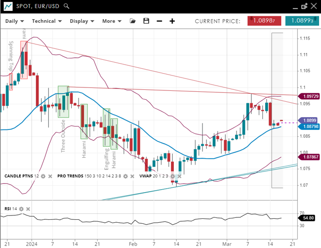 EUR/USD remains in a bullish trend and just about in the impulsive phase, with its price at 1.0900, marginally above its upward-sloping 20-period VWAP of 1.0879. The support is now at 1.0786, with resistance at 1.0972. The RSI at 54 indicates a stable positive momentum.