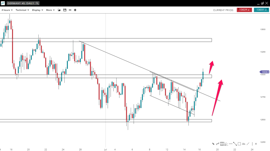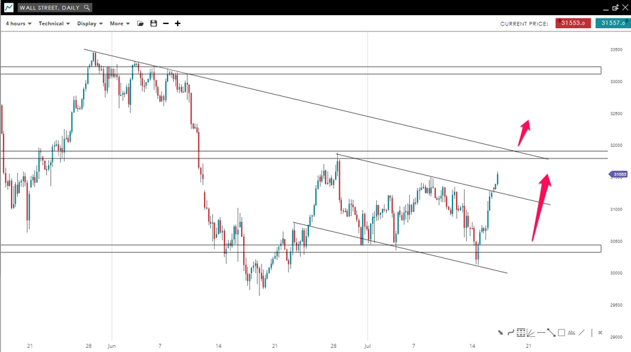 Wall Street successfully broke higher from a down-sloping channel after finding buyers near the 30,300 mark. The market is heading toward a strong resistance level from the June 28 peak which coincides with a bearish trendline. If the market manges to break this area of confluence the price could reach the next key resistance level around 33,200.