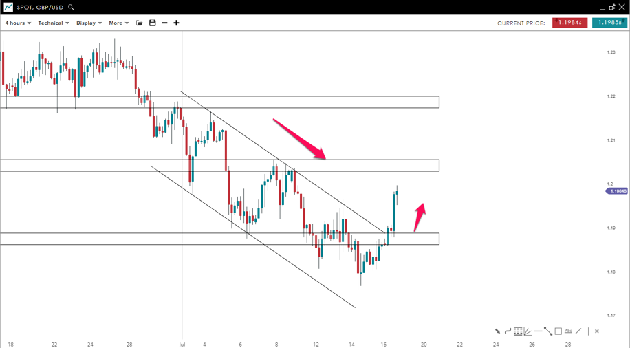 The price of “GBP/USD” successfully broke the bearish channel to the upside after the buyers managed to reverse it with a V-bottom near the 1.18 mark. The price could be set to test the pivot level (1.20). If the breakout completes with a close over 1.20, the price could reach the 1.22 mark by the end of this week.