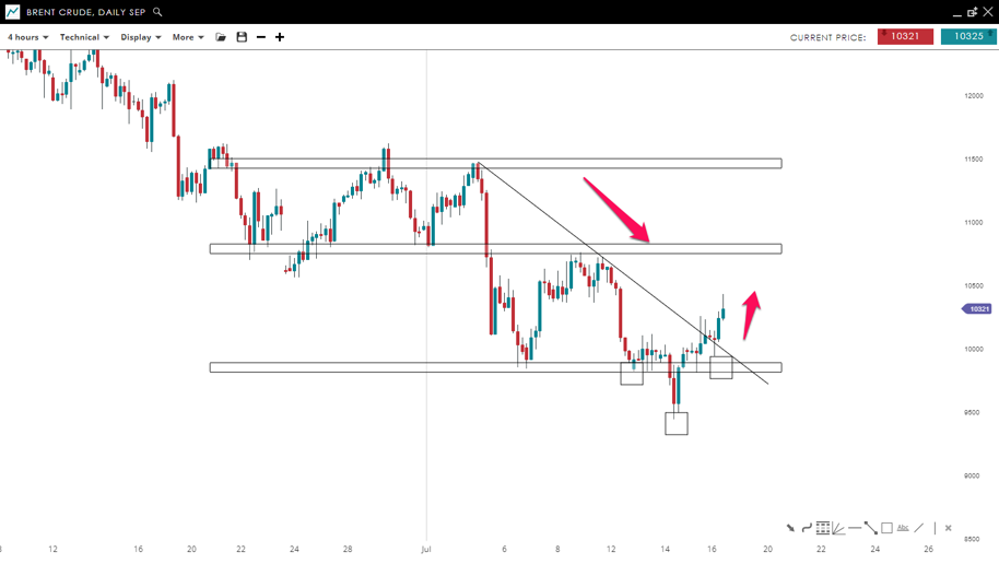 Brent Crude Oil successfully broke the bearish trendline to the upside after posting an inverse head and shoulders. The bulls could be about to push the market toward the 107 mark, which has been S/R since mid-June. If more buyers join the uptrend above the 107 level, this could lead to a further movement to the upside toward resistance from the July high around 114.