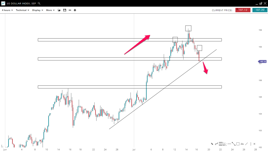 DXY couldn't continue its move upward where it faced strong resistance nera the 108.5/109 zone (just shy of the 110 round number). The price posted a head and shoulders, which led to a reversal and a move lower. The market now is testing the strong support around 107, the neckline of the H&S, and if it manages to break and close below it, the dollar index could reach the 105 mark.