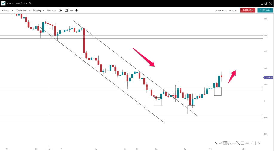 EUR/USD is no longer inside a bearish channel formation after the market posted an inverse head and shoulders near the 1.00 mark which led to a reversal and a move higher. If the price continues its move to the upside, there is a chance to see the EUR/USD reach the 1.04 mark.