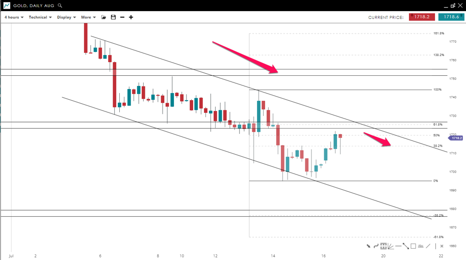 Gold is in a clear downward movement where lower lows and highs have been posted. The market is currently retracing to an area of confluence made by the resistance level (1,725) and the 61.80 % fibonacci retracement level. While the price remains within this channel, sellers might ride the downtrend back toward the 1,675 mark.