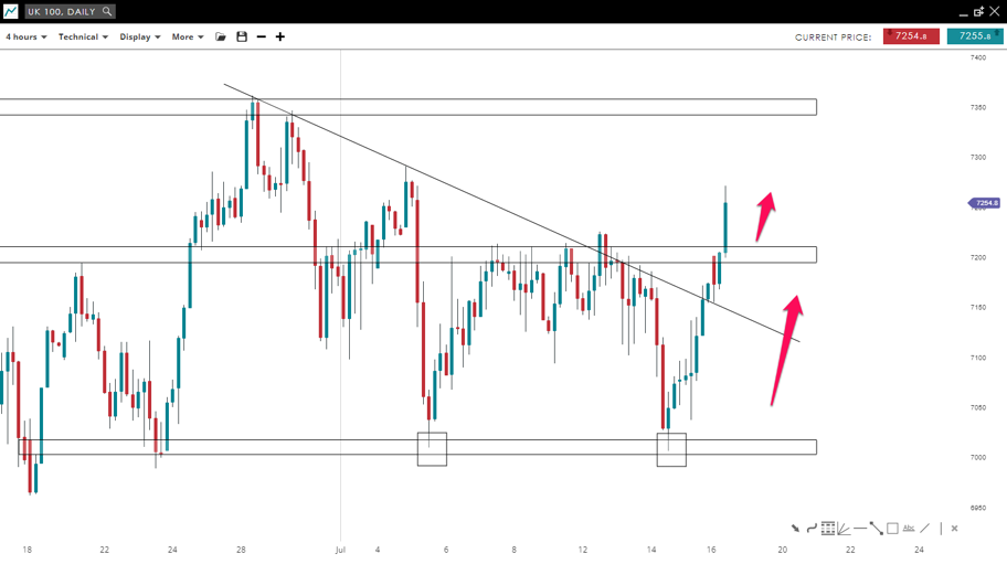 UK 100 broke the bearish trend line to the upside after posting a double bottom pattern near the 7,000 mark. In addition, the index closed above the strong resistance level around the 7,200 mark. While above this level, there is a high chance that the buyers keep pushing the price to reach the 7,350 mark (June 28 high) by the end of the week.