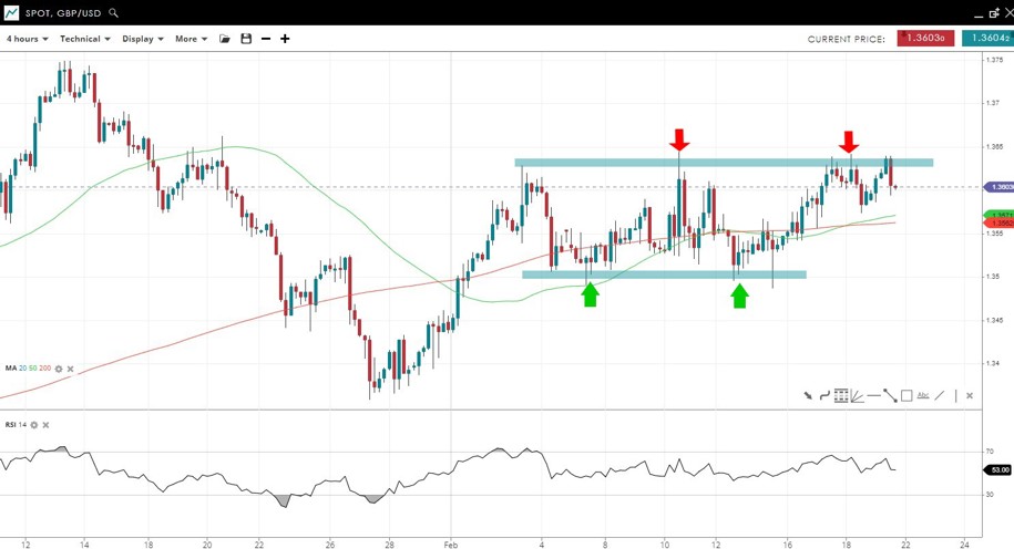 Price is back at the top of its 1.35 to 1.364 trading range.