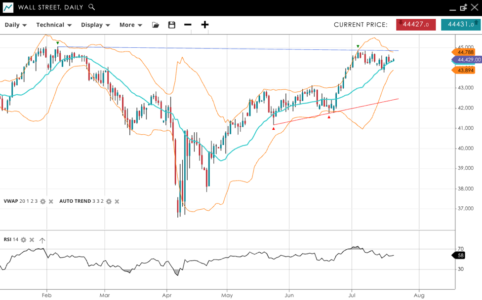 Wall Street remains bullish but is experiencing a pullback just under the March highs, trading at 44,429 just above the VWAP of 44,400. The RSI at 58 suggests moderate bullish momentum. Support is at 43,894, and resistance is at 44,788.