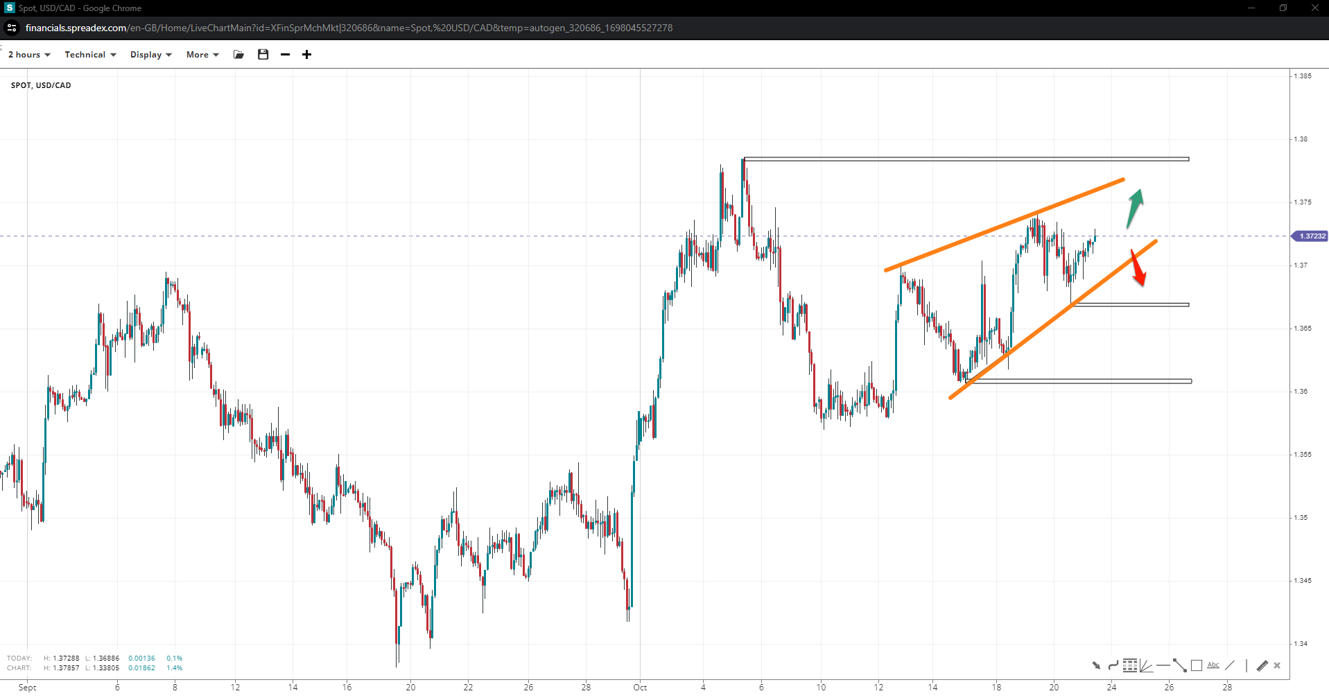 The USD/CAD pair may be about to complete a wedge towards $1.3785m, with price action perhaps reaching $1.38. Falling under the $1.3670 support could invalidate the pattern and open the door to 1.36.