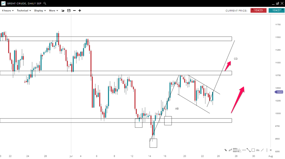 After posting an inverse head and shoulders pattern near the support level, the market hit resistance at 107, where a pullback has created a bullish flag formation. If buyers push the price higher from this pattern and above the 107 mark, the price of UKBRENTOIL could reach 114. The less likely scenario is a failure to move over 107, which could lead to a move down towards the 98 mark.