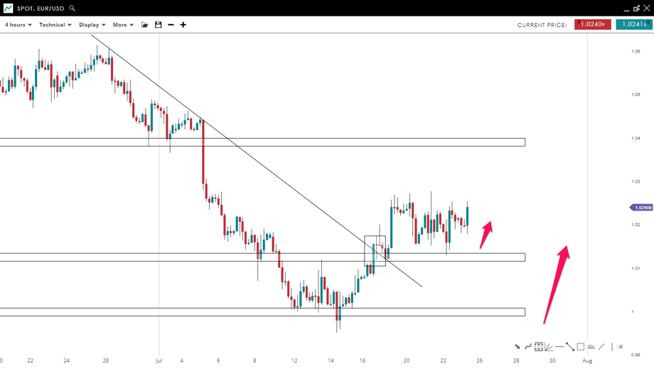 EUR/USD successfully broke the bearish trend line to  the upside after finding buyers near the 0.99 mark. The price now entered into a consolidation period where a breakout to the upside could be seen before a move all the way up toward the 1.03 mark. A less likely scenario is for the EUR/USD to  reverse lower again from the consolidation to test the previous support near 0.99.