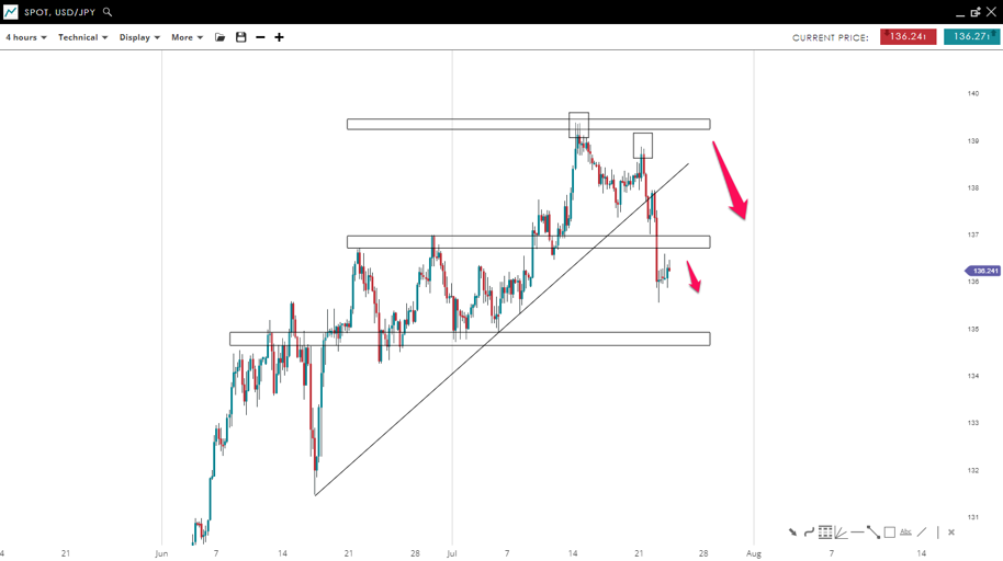 The price of “USD/JPY” broke below the bullish trend line after posting a double top formation. The market is now posting lower lows and highs, signalling that sellers are in clear control. A slight correction to the upside could be seen before a new bearish impulsive wave that could push toward the 134 mark. In case the USD/JPY rebounds and closes above the 136 mark, this could lead to a reversal and a move higher toward the 139 level.