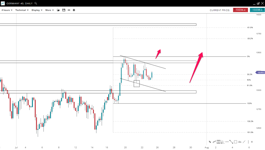 GER40 is in an uptrend where its price entered a bullish flag formation after bouncing from the 61.8% fibonacci retracement level. A break and close above the pivot level would indicate the market could reach 13,875 by the end of the week. A failure in breaking the 13,380 mark could lead to a move toward 13,000.